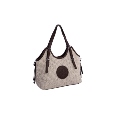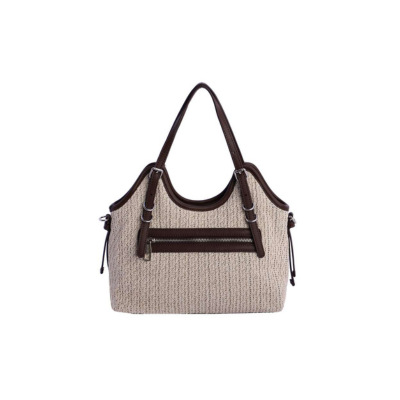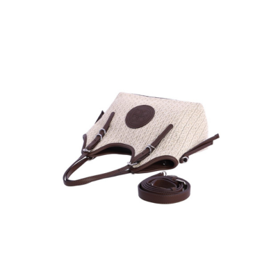 Este bolso de la marca Amichi presenta un diseño estructurado con texturas estilo rafia y detalles en marrón.