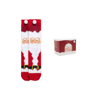 Estampado de Papá Noel sobre fondo rojo, con pompón decorativo y detalles en blanco y negro. ¡El complemento más navideño y divertido!