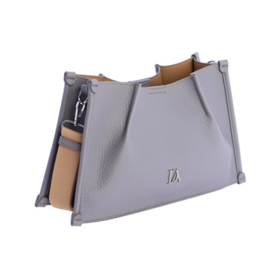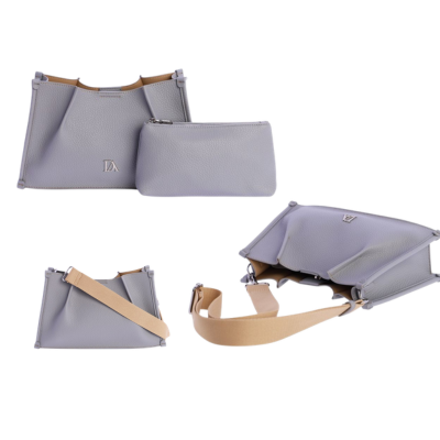 Bandolera con detalles de pliegues central y correa de nylon ajustable. Incluye neceser interior. El color es azul grisáceo con correa beige.