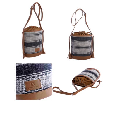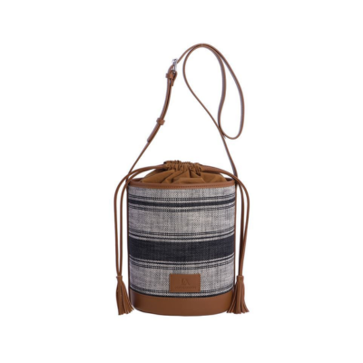 Bolso tipo saco de Don Algodón, en color marrón con rallas negras y beiges. Con bandolera extensible. Cierre con cordón. En el interior un pequeño bolsillo con cremallera, y un pequeño departamento. Medidas 26x25x15 cm.