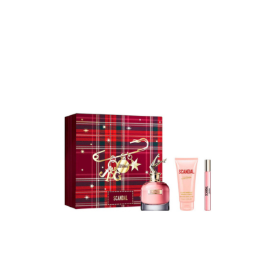 El estuche de regalo Eau De Parfum Scandal de Jean Paul Gaultier incluye un eau de parfum de 80 ml, una loción corporal perfumada de 10 ml y una loción corporal de 75 ml.