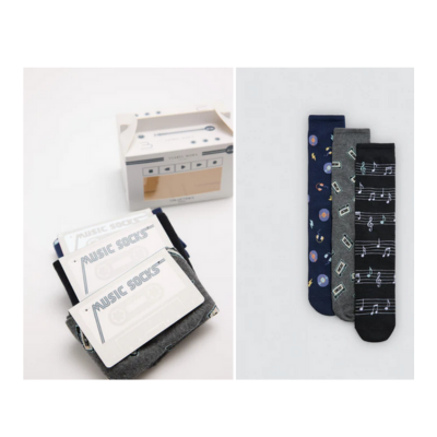 Presentación especial: caja decorativa con diseño de cassette y el mensaje "Music Socks", ideal como regalo.