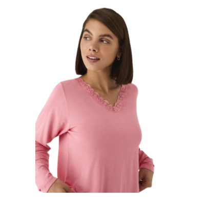 Pijama de pantalón y camiseta de manga larga, cuello de pico y detalle de encaje. 95% viscosa / 5% elastano