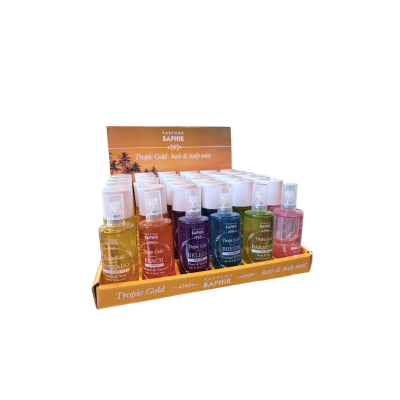 Sumérgete en una sensación de verano eterno con Tropic Gold Hair & Body Mist de Saphir, una bruma ligera diseñada para perfumar delicadamente tanto la piel como el cabello.